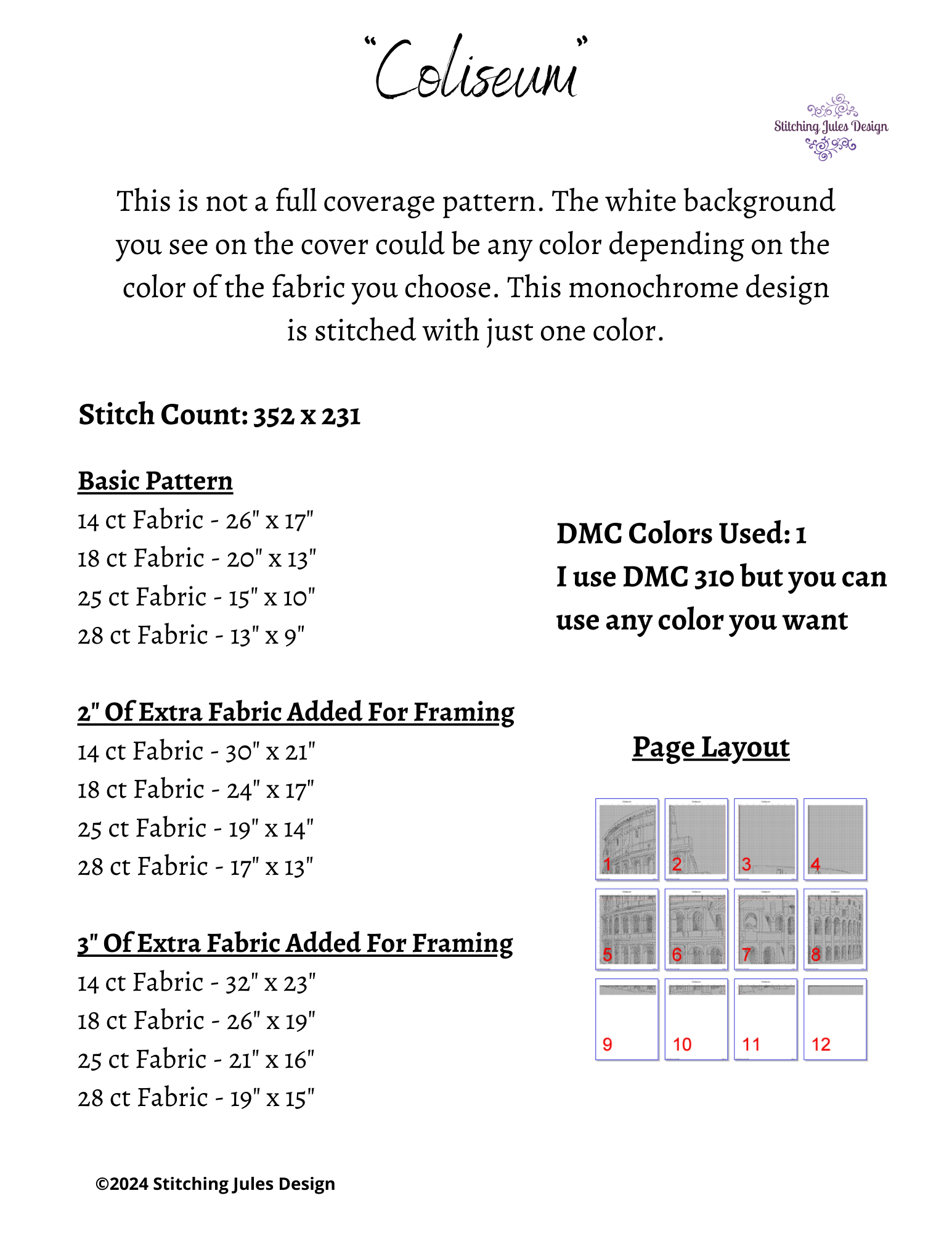 This counted cross stitch pattern depicts the Coliseum from Ancient Rome that still stands in Italy today. This cross-stitch pattern is easy to read and suitable for an intermediate cross stitch enthusiast that is comfortable with larger patterns.