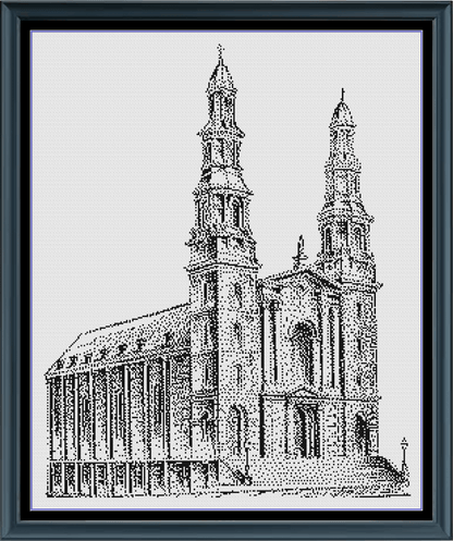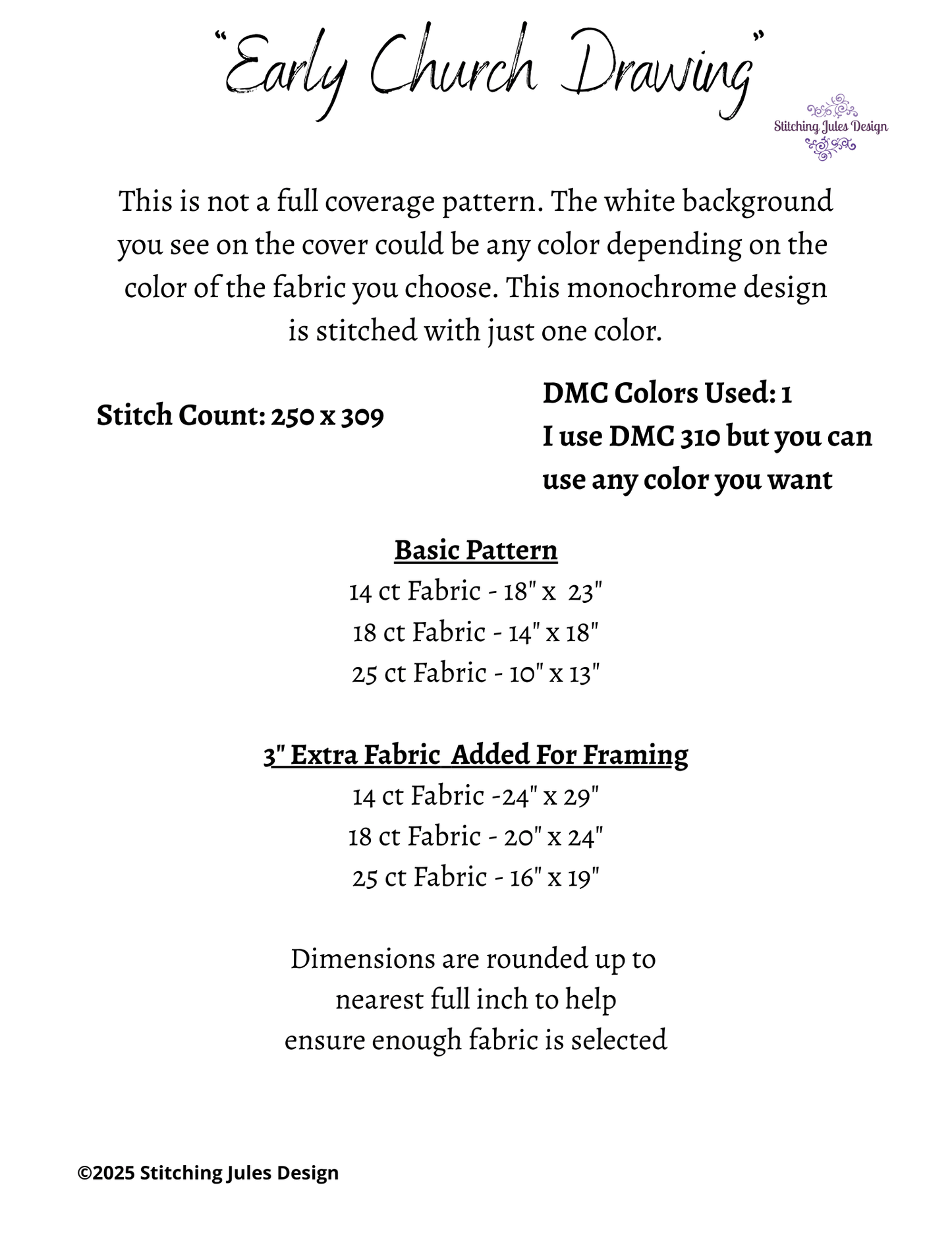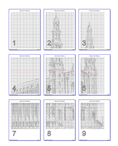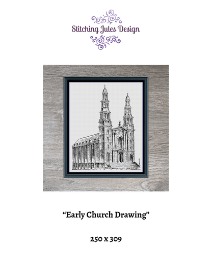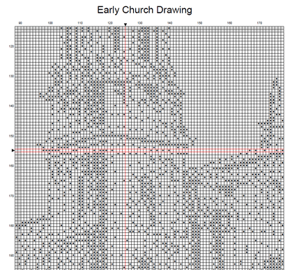 Early Church Drawing is a monochrome counted cross-stitch pattern. The pattern is very easy to read and uses only full cross-stitches. You are stitching one color of floss onto a light-colored fabric so you are doing less stitches than you may think.